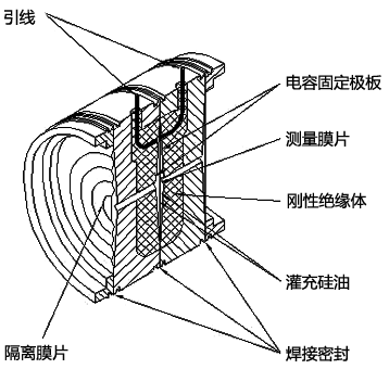 從圖2、圖3可以看出金屬電容式是兩邊受壓,壓力經隔離膜片傳遞到內部中心膜片上。
