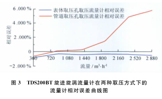 例, 系統運行時間為 6 0s , 標準裝置的滯止平均溫度為2 9. 7℃ , 空間平均濕度為 4 2% , 流量計的平均溫度為2 9. 3℃ , 在表體取壓孔取壓和管道取壓孔取壓的流量計檢定試驗數據分別如表 3 、 4 所示。兩種取壓方式下的流量計相對誤差曲線如圖3所示。