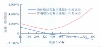 從以上數據表和曲線圖中可以看出: 天然氣流量計型號一定的情況下, 用表體取壓孔取壓方式檢定流量計時流量計的線性度較好, 用管道取壓孔取壓方式檢定流量計時流量計的線性度較差; 流量測點相同的情況下, 表體取壓孔取壓檢定方式的流量計誤差較小, 管道取壓孔取壓檢定方式的流量計誤差較大; 兩種取壓方式引起的誤差隨著流量的增大而逐漸增大, 在流量為2 9 0 0m3 /h時兩者相差近6. 2% , 遠遠超出了流量計的準確度等級。所以, 在天然氣流量計的檢定過程中, 應避免在流量計表體取壓孔以外的地方取壓進行檢定。