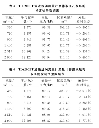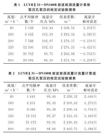 以使用**的D N 1 0 0 B天然氣流量計為例, 系統運行時間為6 0s , 標準裝置的滯止平均溫度為 2 8. 9℃ , 空間平均濕度為 3 0% , 流量計的平均溫度為 2 8. 3℃ , 在表體取壓孔取壓和管道取壓孔取壓的流量計檢定試驗數據分別如表 1 、 2 所示。