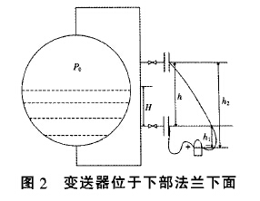 變送器位于下部法蘭下面.和圖1一樣使用常用的高壓側接下面、負壓側接上面的引壓方式,變送器的布置和常規電廠高加液位測量以及常見密閉容器測量液位一樣.如圖2所示 這種安裝方式一般需要把變送器布置于容器所在平臺的下一層變送器正壓側所受的壓力為: