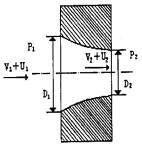 采用了變徑整流器后(見圖2),由于縮經斷面的流速在逐漸增大,在斷面上各點流速的增加是不一樣的,靠近中心流速增加小,而靠近喉徑邊沿處流速增加大。 設整流器進口處壓力為P1,平均流速為V1,某點上的速度不均勻度為U1,出口處壓力為P2,平均流速為V2,通過進口處某點同一流線,在出口處的速度不均勻度為U2,沿該流線,由伯努利方程得: |  |