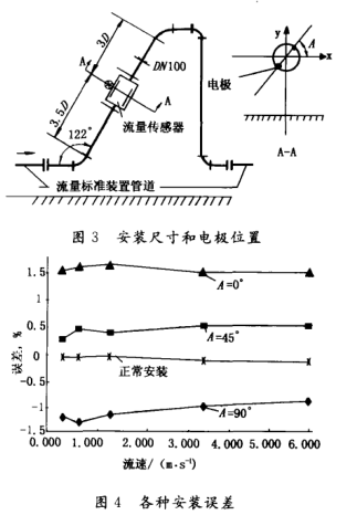 1)在本試驗安裝條件下,流量傳感器電極軸在A一90。位置時大誤差為一1.2,A一0。位置時為+1.6,A一45。位置時為0.5;與正常安裝條